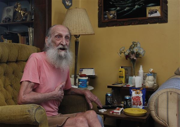 Dallas Watts, 78, indicates where he was kicked during an assault that took place in East Toledo on Saturday. He said there were six boys, the youngest one 11 years old.