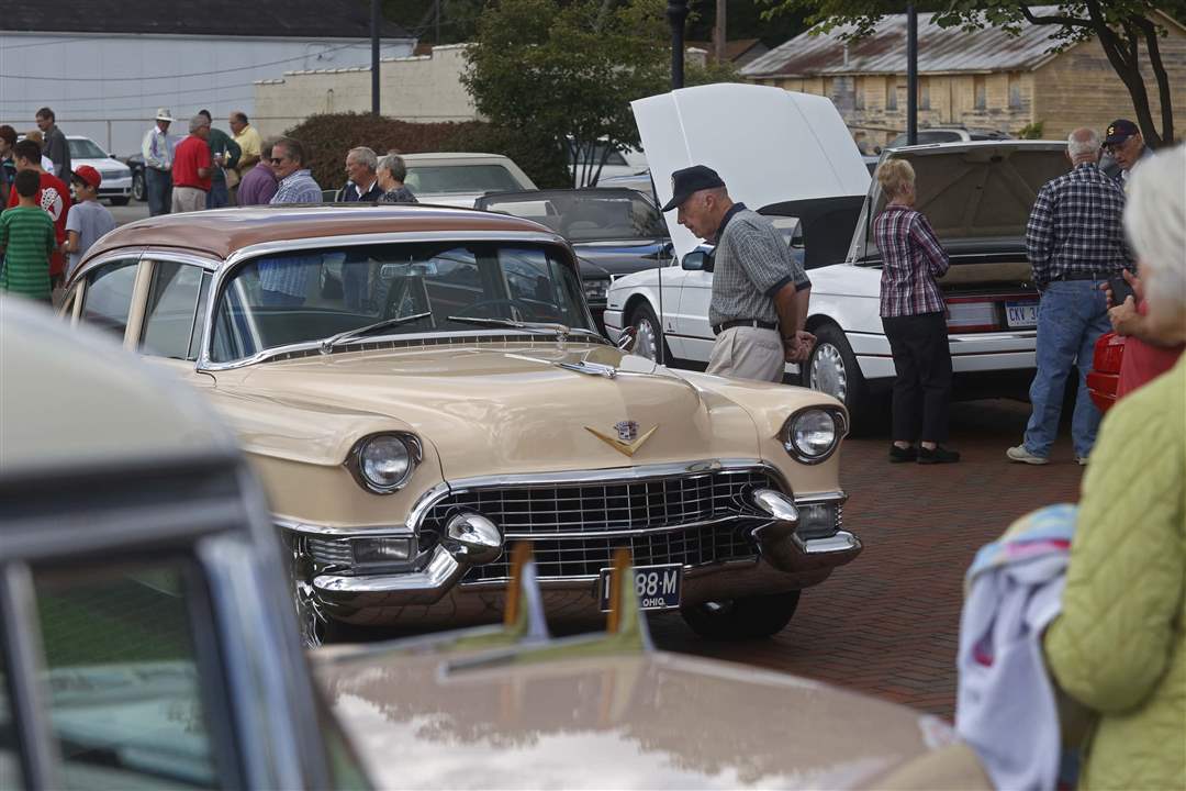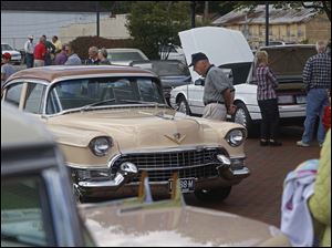 Gerald Hazel, 82, of Perrysburg, center, inspected a peach 1955 #6219 Cadillac DeVille owned by Rick Fry of Northwood.