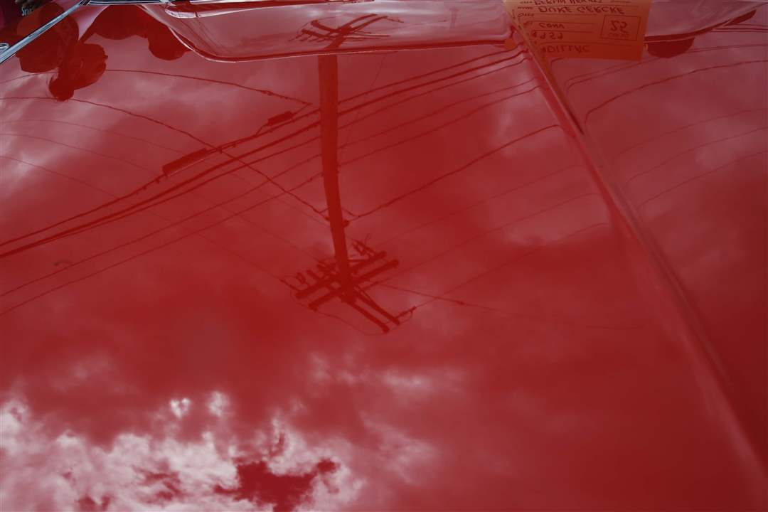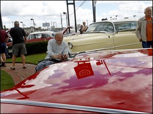 Reflected in the hood at left, Crystal Mays, of North Toledo, left, takes a look at a 1959 convertible owned by Duke Gercke of Berlin Heights.