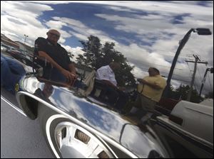 Several classic Cadillac owners and enthusiasts, including John Nagel, of Sylvania, left, are reflected in a black 1969 Eldorado owned by Jack Wilmarth of South Toledo.