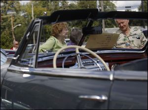 Vicki Haas, 70, left, and Alan Haas, 73, of Sylvania, right, chat while taking a look at several classic cars.