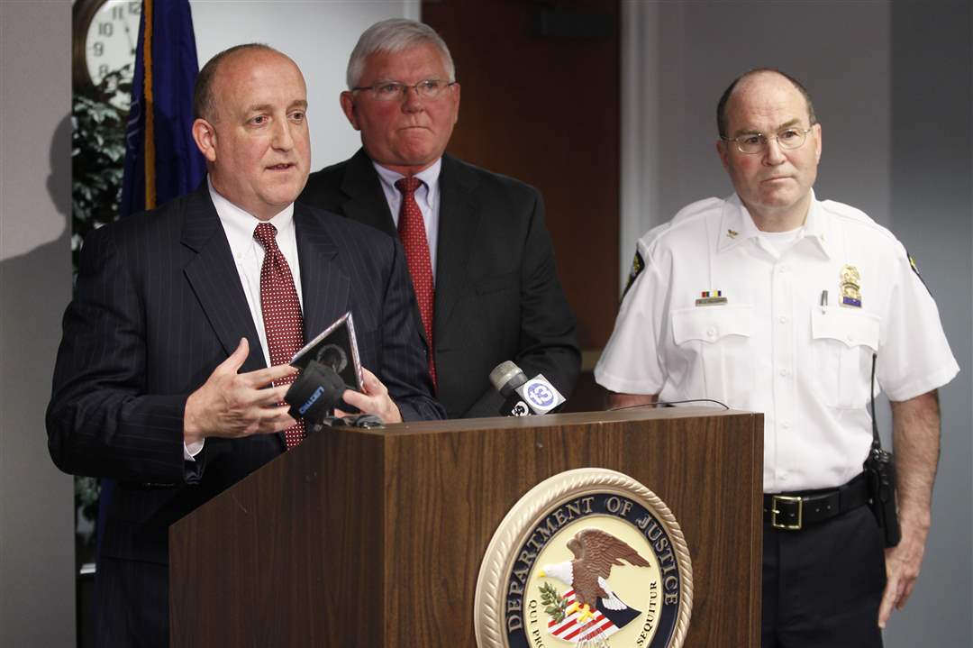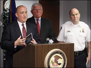 Stephen Anthony, Special Agent in Charge of the Cleveland FBI office, left, David Bauer, assistant U.S. Attorney in charge of the Toledo office, and Toledo Police Chief Mike Navarre, announce indictments against 20 people involved in a drug trafficking ring, during a news conference at The U.S. Attorney's office in Toledo.