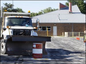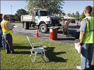 Judges Hussein Abounaaj, holding clipboard, left, and Jason Askins, right, watch as driver Matt Nelson maneuvers his plow truck past a simulated mailbox during the Ohio Department of Transportation District Two Annual Roadeo in Bowling Green.