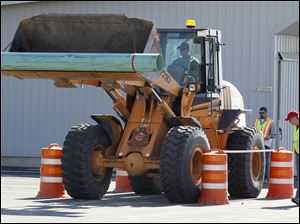 Driver Gary Sears maneuvers his loader through an obstacle course as judges Darian Grant, left, and Rich Shatzer, right, watch.