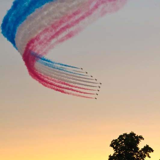 The Red Arrows fly over London to herald in the Olympic Opening Ceremony Celebration Concert in Hyde Park, London. The concert is part of a series of events being organised by the Mayor of London, Boris Johnson, to celebrate the London 2012 Olympic Games.