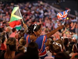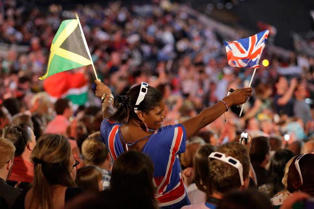 A spectator waves a flag of Great Britain, right, and Jamaica during the Opening Ceremony at the 2012 Summer Olympics.