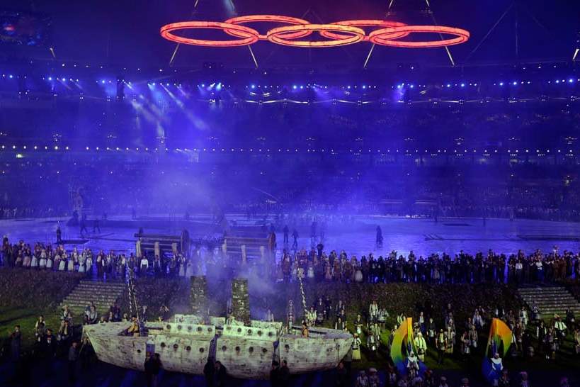 Athletes march in the stadium during the Opening Ceremony at the 2012 Summer Olympics.