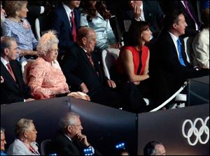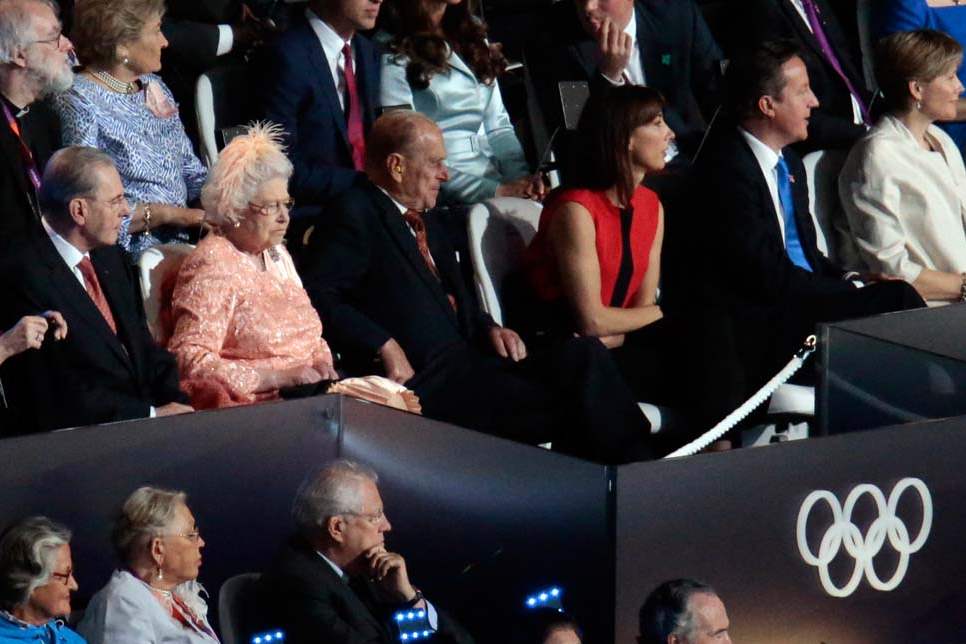 From left, Jacques Rogge, Queen Elizabeth, Britain's Prince Philip, the Duke of Edinburgh, Samantha Cameron and British Prime Minister David Cameron attend the Opening Ceremony at the 2012 Summer Olympics.