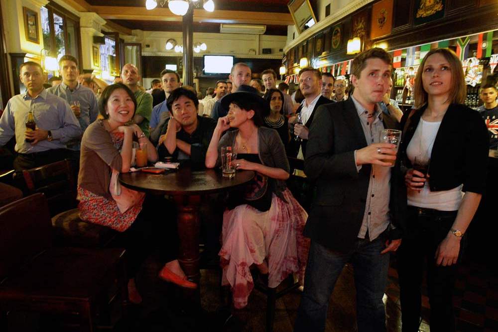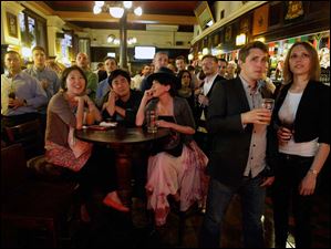 Laura Tumaite, of Lithuania, right, and Cole Morris, of the United States, second from right, watch a broadcast of the Opening Ceremony for the 2012 Summer Olympics at the The Railway Tavern.