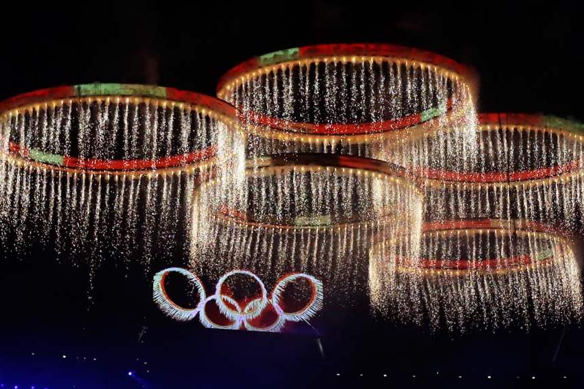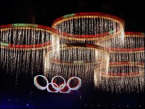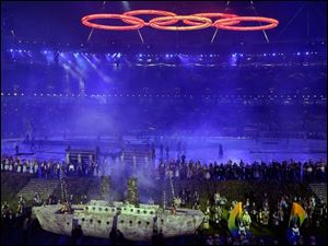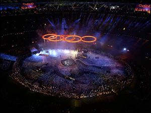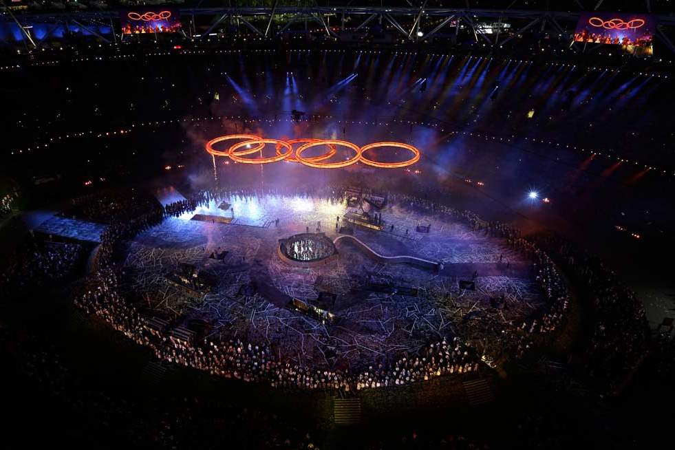 The Olympic rings light up the stadium during the Opening Ceremony at the 2012 Summer Olympics.