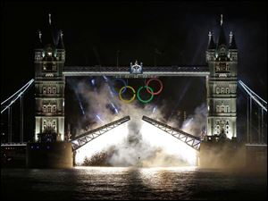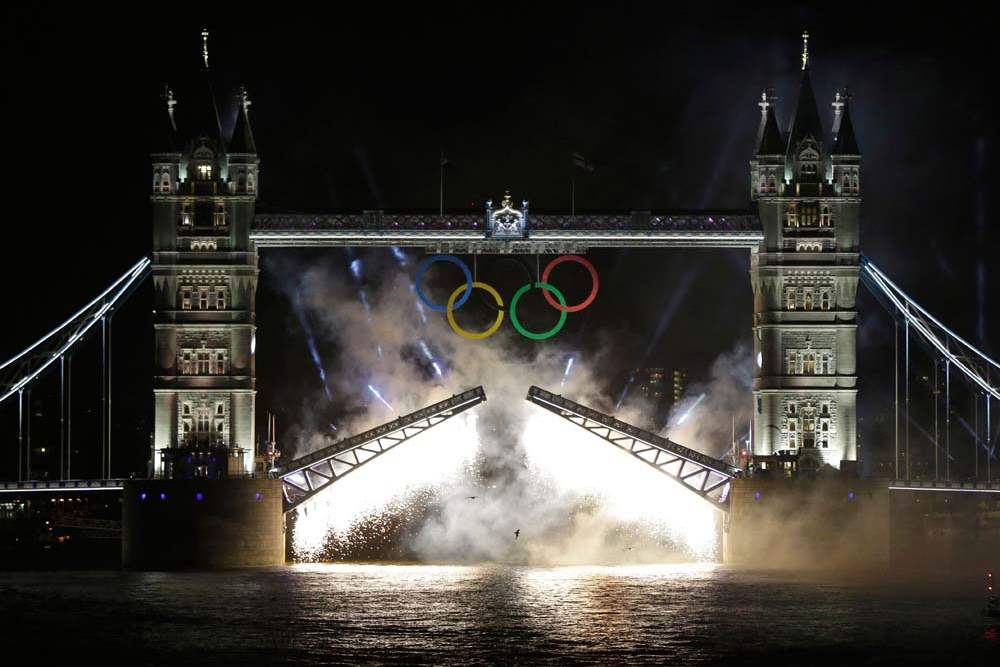 Smoke from fireworks surrounds the iconic Tower Bridge over the River Thames in central London, decorated with Olympic rings, during the Opening Ceremony at the 2012 Summer Olympics.