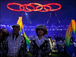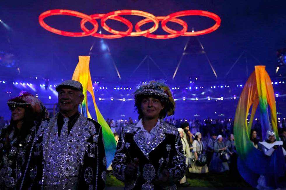 Performers dressed as a Pearly King and Queen are seen as the Olympic rings are illuminated during the Opening Ceremony at the 2012 Summer Olympics, Friday.