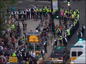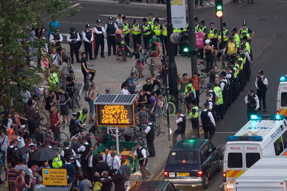 Police surround part of a group of protesting cyclists who tried to block traffic with a mass cycle ride on a road outside the Olympic Park during the Opening Ceremony of the 2012 Summer Olympics.