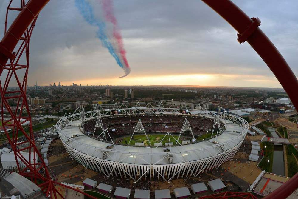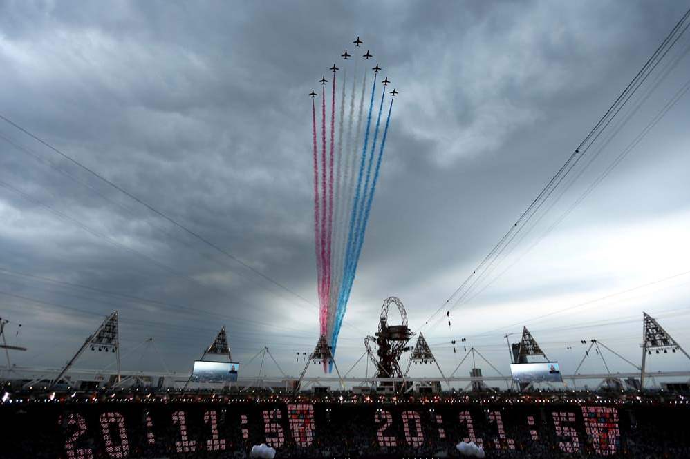 The Red Arrows, the Royal Air Force aerobatic team fly over the stadium prior to the Opening Ceremony of the 2012 Olympic Summer Games at the Olympic Stadium in London.