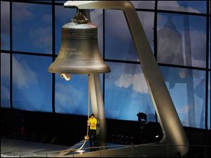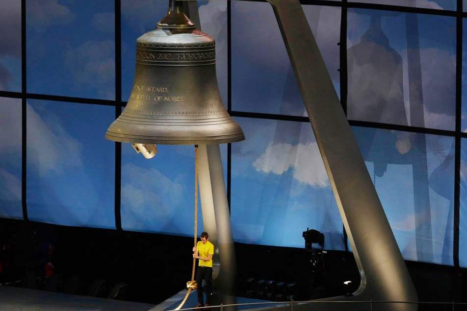 Tour de France champion Bradley Wiggins ring a bell during the Opening Ceremony at the 2012 Summer Olympics.