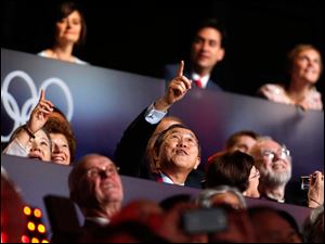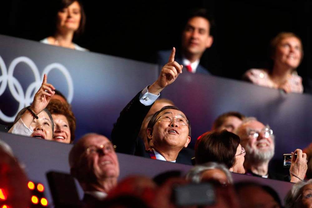 United Nations Secretary General Ban Ki-moon, center, gestures during the Opening Ceremony at the 2012 Summer Olympics, Friday,.