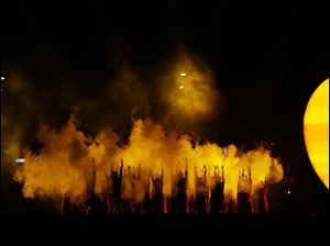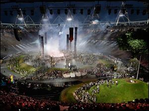 Fireworks explode while artists perform during the Opening Ceremony of the 2012 Olympic Summer Games at the Olympic Stadium in London.