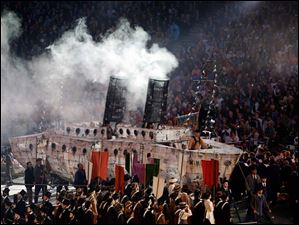 Fans watch actors perform during the Opening Ceremony at the 2012 Summer Olympics.