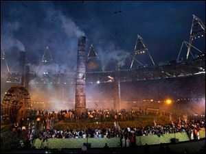 Chimneys rise during the Opening Ceremony of the 2012 Olympic Summer Games at the Olympic Stadium in London.