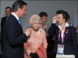 Queen Elizabeth II, Princess Anne, right, and Prime Minister David Cameron arrive for the Opening Ceremony of the 2012 Olympic Summer Games at the Olympic Stadium in London.
