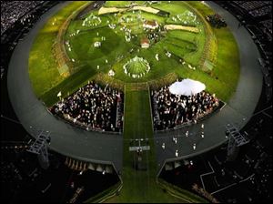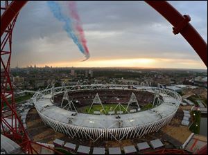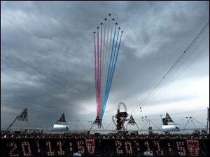 The Red Arrows aerobatic team flies over the Olympic Stadium during the Opening Ceremony at the 2012 Summer Olympics, Friday.