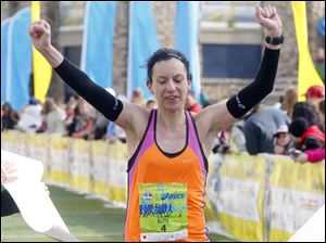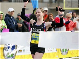 Tamara Marquardt, from Shaker Heights, Ohio, crosses the finish line first for the women in the half marathon.