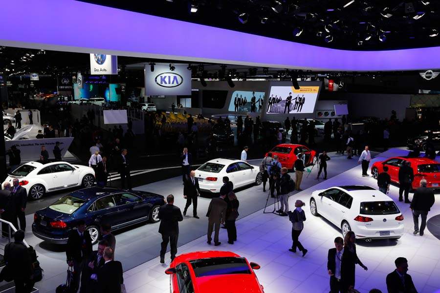 Volkswagens and Kias are on display at the North American International Auto Show in Detroit.
