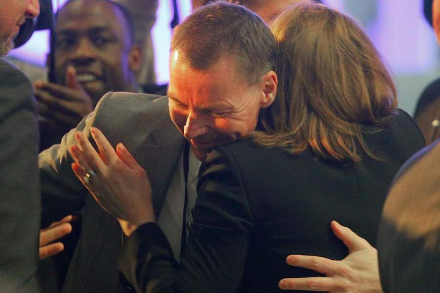 GM Silverado Chief Engineer Jeff Luke hugs General Motors' CEO-designate Mary Barra at the North American International Auto Show after winning truck of the year.