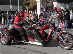 Grand Marshall Olympic silver medalist and Toledo native Erik Kynard gets a ride with Santa Claus in his sleight on the float with members of the U.S. Marine Corps Reserve marching alongside.