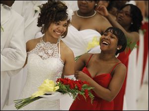 Debutante-in-Waiting Kiarah Allen, right, and debutante Tonyce Hollis share a laugh after Miss Allen presented Miss Hollis with a pearl necklace.