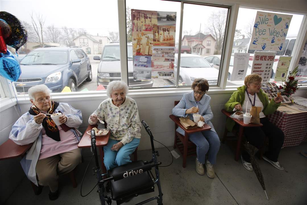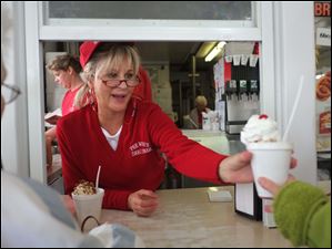 Customers lineup for food at Pee Wee's Dari Snak; Dolores Zernhel of Perrysburg, holds a banana split, right.