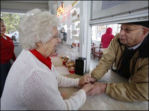 Maxine Haas is greeted by friend John Ballmer of Toledo.