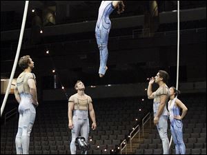 The Cirque du Soleil troupe using the corde lisse practices inside the Huntington Center Wednesday.