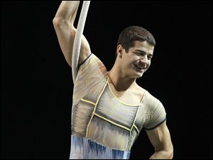 Guilherme Fortes, left, and JP Viens, right, stretch out before practicing a piece using corde lisse during Cirque du Soleil's dress rehearsal in preparation for the Toledo premiere of 'Quidam.'