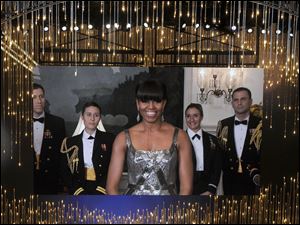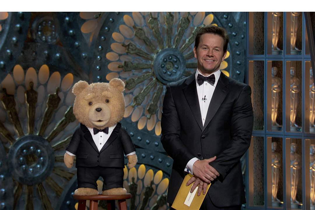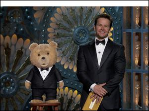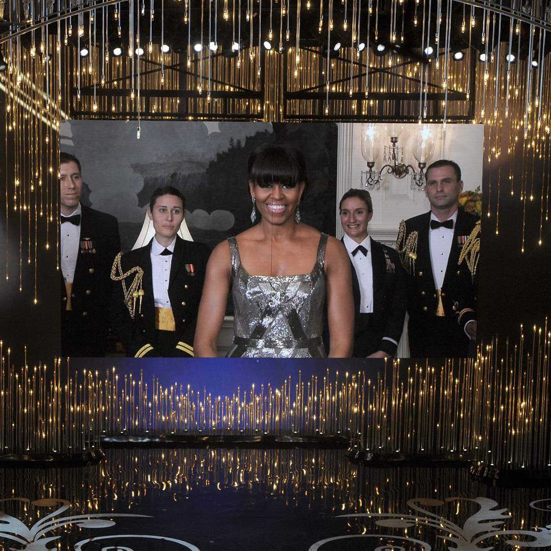First lady Michelle Obama, appearing on screen, and actor Jack Nicholson present the award for best picture.