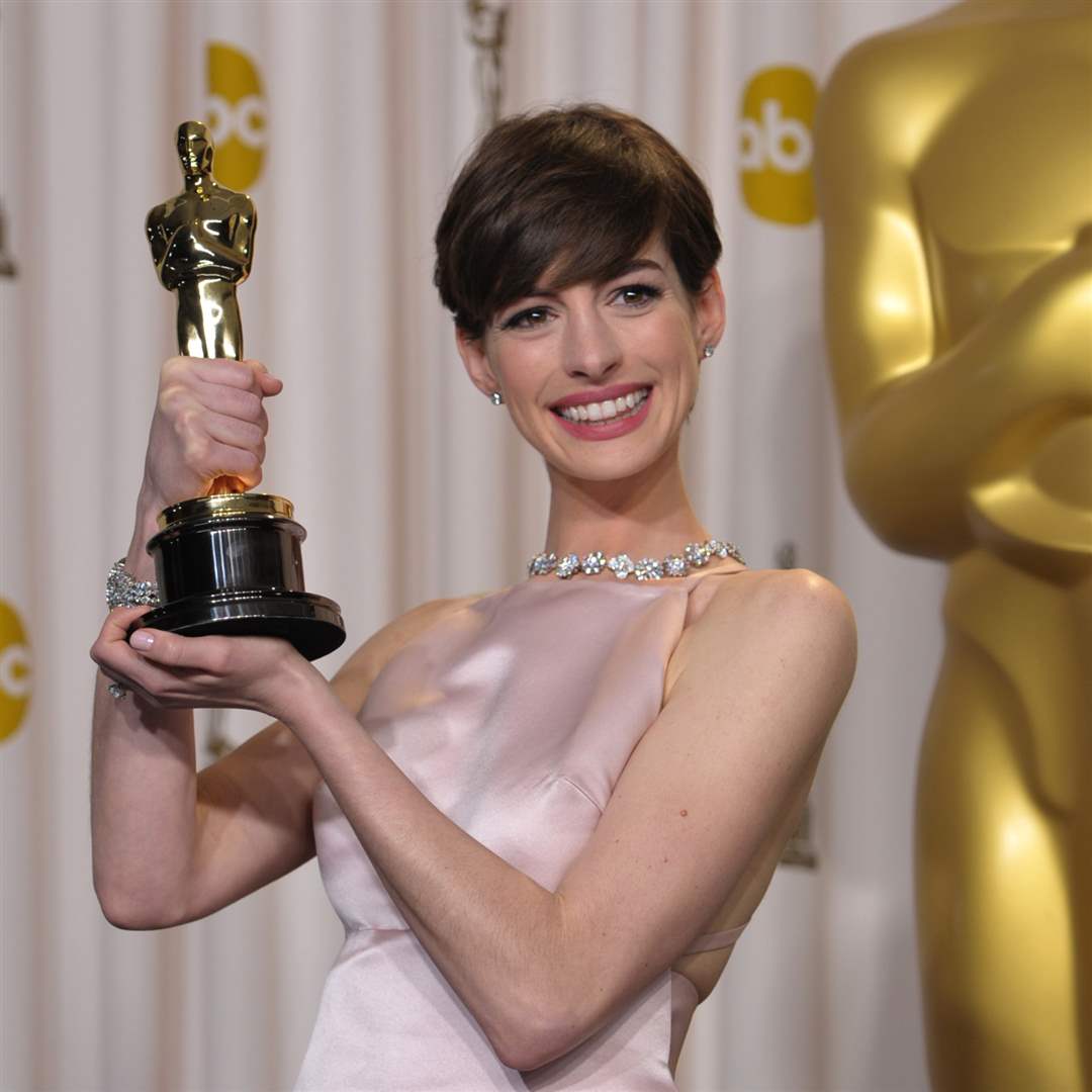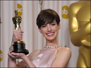 Anne Hathaway poses with her award for best actress in a supporting role for "Les Miserables."
