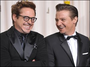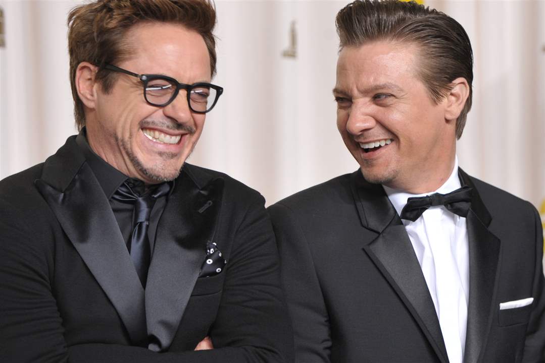 Oscar presenters Robert Downey Jr., left, and Jeremy Renner share a laugh.