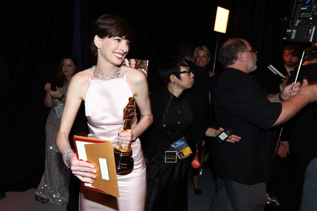Anne Hathaway stands backstage with her award for best supporting actress.