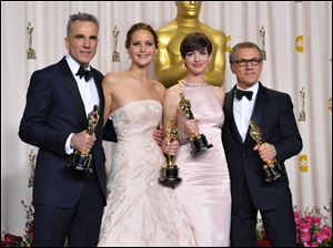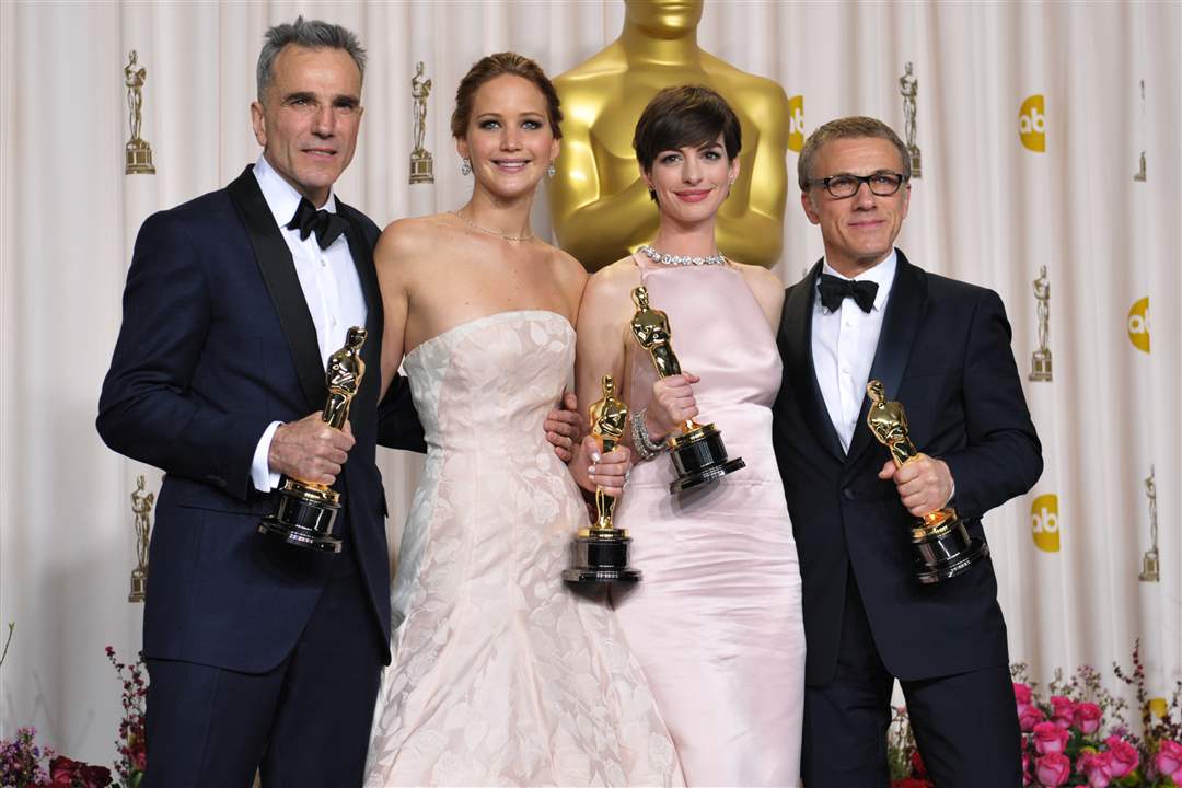 From left, Daniel Day-Lewis, with his award for best actor in a leading role for "Lincoln," Jennifer Lawrence, with her award for best actress in a leading role for "Silver Linings Playbook," Anne Hathaway, with her award for best actress in a supporting role for "Les Miserables," and Christoph Waltz, with his award for best actor in a supporting role for "Django Unchained."
