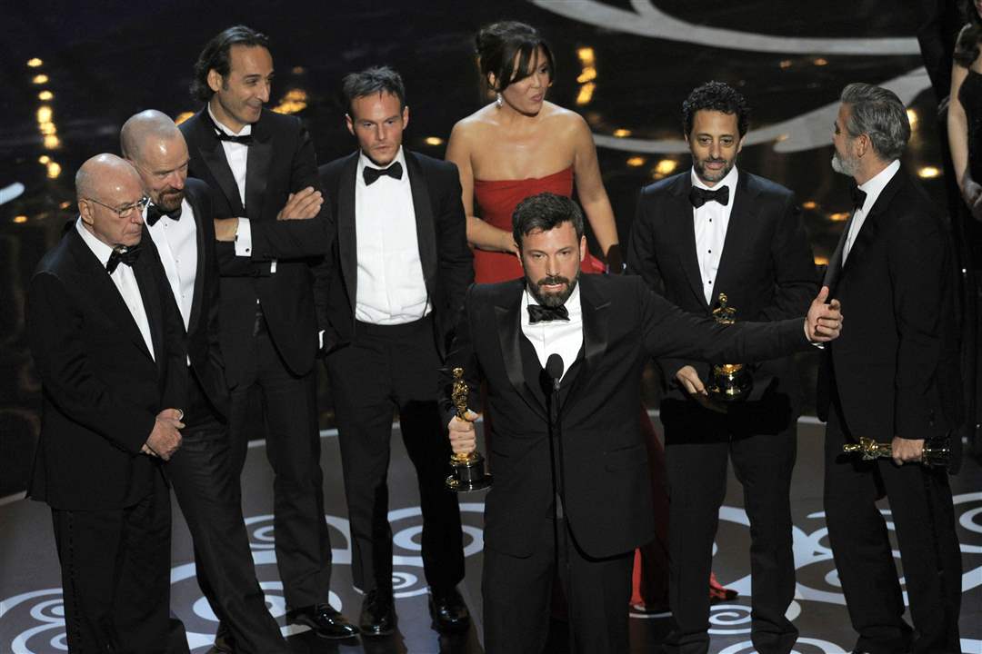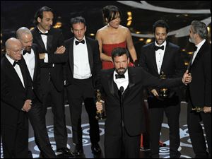 Director/producer Ben Affleck, center, accepts the award for best picture for "Argo," as the cast and crew look on.