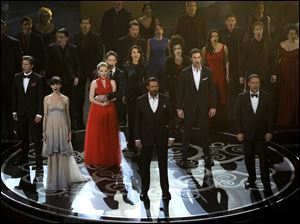 From left, actors Aaron Tveit, Anne Hathaway, Amanda Seyfried, Eddie Redmayne, Samantha Barks, Hugh Jackman, Helena Bonham Carter, Sacha Baron Cohen and Russell Crowe, from the cast of "Les Miserables," perform during the Oscars.