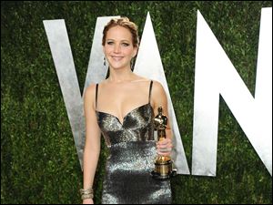 Actress Jennifer Lawrence arrives at the 2013 Vanity Fair Oscar party with her award for best actress in a lead role.