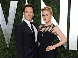 Stephen Moyer, left, and actress Anna Paquin arrive at the 2013 Vanity Fair Oscar Party.