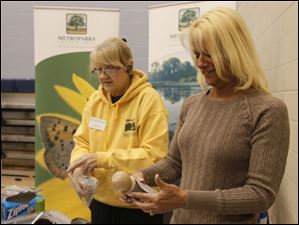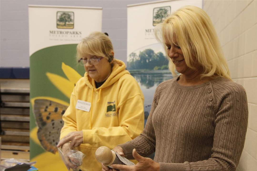 Master gardener and volunteer Judy Dugan, of Sylvania Township, left, signs in with Barbara Cooper, of Sylvania at the event.