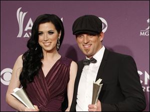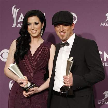 Shawna Thompson, left, and Keifer Thompson, of musical group Thompson Square, pose backstage with their awards for vocal duo of the year at the 47th Annual Academy of Country Music Awards.