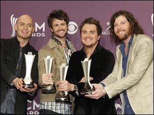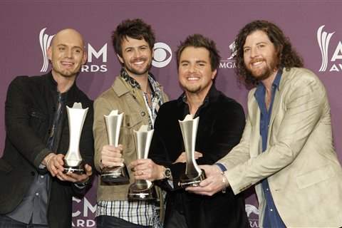 From left, Jon Jones, Chris Thompson, Mike Eli and James Young, of musical group The Eli Young Band, pose backstage with the award for song of the year for "Crazy Girl" at the 47th Annual Academy of Country Music Awards.