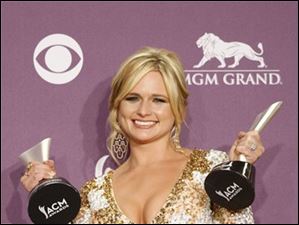 Miranda Lambert poses backstage with the awards for album of the year for "Four the Record" and female vocalist of the year at the 47th Annual Academy of Country Music Awards.