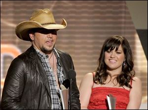 Jason Aldean, left, and Kelly Clarkson accept the award for single of the year for "Don't You Wanna Stay" at the 47th Annual Academy of Country Music Awards. They also won for Vocal Event of the Year with "Don't You Wanna Stay."