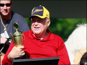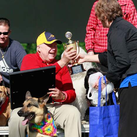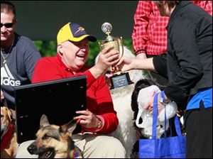 Bob Reinbolt, of Toledo, accepts the winner's trophy on behalf of Katie, his German Shepherd who is the winner of the 2013 Toledo Blade Pet Idol contest.