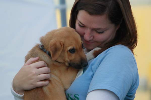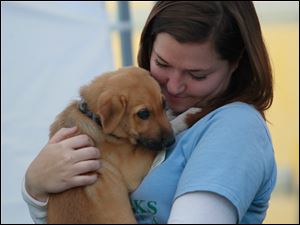 Corinne Whewell, of Maumee, and an employee of the Metroparks in the programming department, with one of three shepherd mix puppies available for adoption through Planned Pethood.